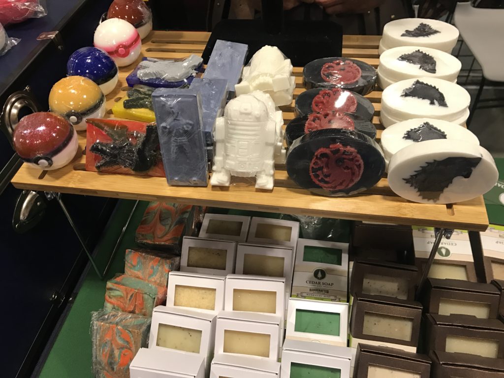 While guests aren’t really my thing, you can bet your ass that I am 100% likely to be found gawking and talking in the vendors area of any convention. DragonCon’s vendors area was actually areas; as opposed to one designated room for dealers and artists to display their wares and take all my money, DragonCon boasted three floors worth of geeky goodies.Anything you could possibly want could be found. Handmade leather armor? Yup. Three-foot tall wall art of hot warrior girls riding dragons in the moonlight? Yes. Elf ears in a variety of skin-tones? Check. Fucking superhero themed luxury soaps and bath bombs? Hell yeah! They got all that glorious shit too! Not to mention the massive variety of handmade plushies, light sabers, collectors items, comics, props, knives, swords, clothing, and more. I was in Heaven.