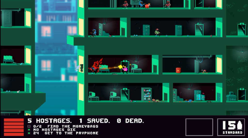 The game is very fast paced, too. One moment you’re fighting one guy to get downstairs and next thing you know, you’re surrounded and getting shot from everywhere! The sooner you master sliding and hiding from enemy fire, the better and easier it’ll be for you. Getting through the game will be a journey, but it’s the challenges you’ll want to beat the most. Each of the 21 levels has 3 objectives to complete. You don’t have to do them, you can just beat the stage and move on. But I mean, don’t you want BunnyLord to get those extra votes?